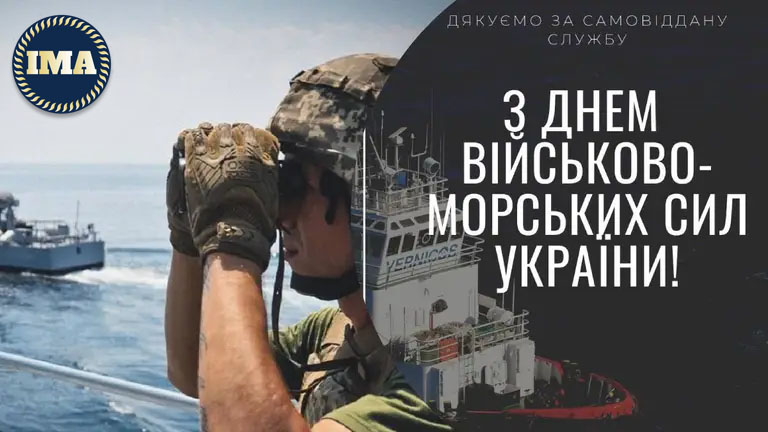 Міжнародна морська асоціація щиро хоче привітати вас з Днем Військово-Морських Сил Збройних Сил України! Бажаємо вам міцного здоров'я, незламної віри у свої сили, родинного затишку та мирного неба над головою. Нехай ваші професійні успіхи завжди супроводжуються заслуженими нагородами, а всі ваші дії приносять тільки перемогу та добробут Україні.